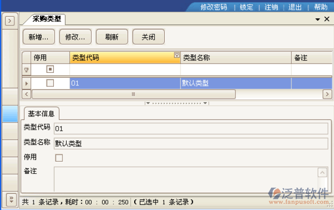 單擊【檔案管理】模塊中【倉庫檔案】的【采購類型】,即彈出如圖6的顯示界面: