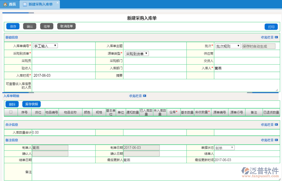 入庫數(shù)量合計、入庫金額合計為入庫單明細(xì)中的實收數(shù)量、入庫金額的合計,不可以修改。