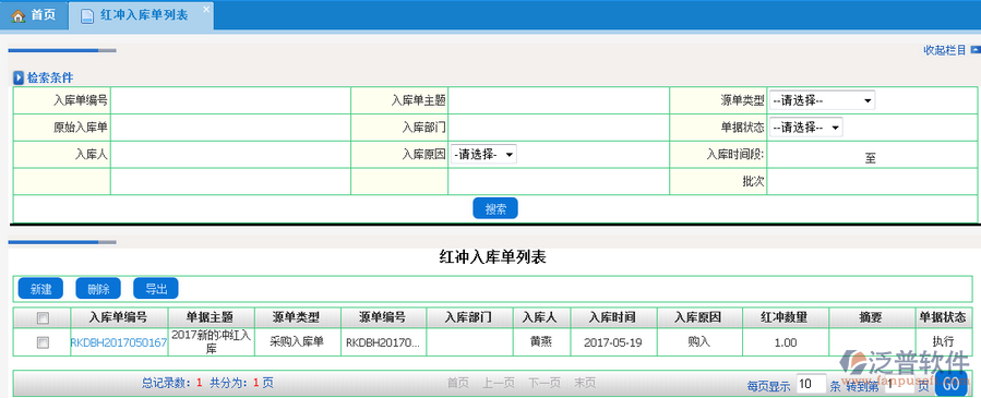 查詢(xún)條件:入庫(kù)單編號(hào)、入庫(kù)單主題、源單類(lèi)型(選擇)、原始入庫(kù)單(選擇)、入庫(kù)部門(mén)、入庫(kù)人(選擇)、入庫(kù)時(shí)間(日期段,日期控件)、單據(jù)狀態(tài)(下拉列表)