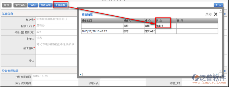 2、填寫完相關(guān)的設(shè)備維修信息,即可點(diǎn)擊【提交審批】進(jìn)入工作流程的審批狀態(tài)。審批通過的設(shè)備維修單才能進(jìn)行一個(gè)正常的維修過程