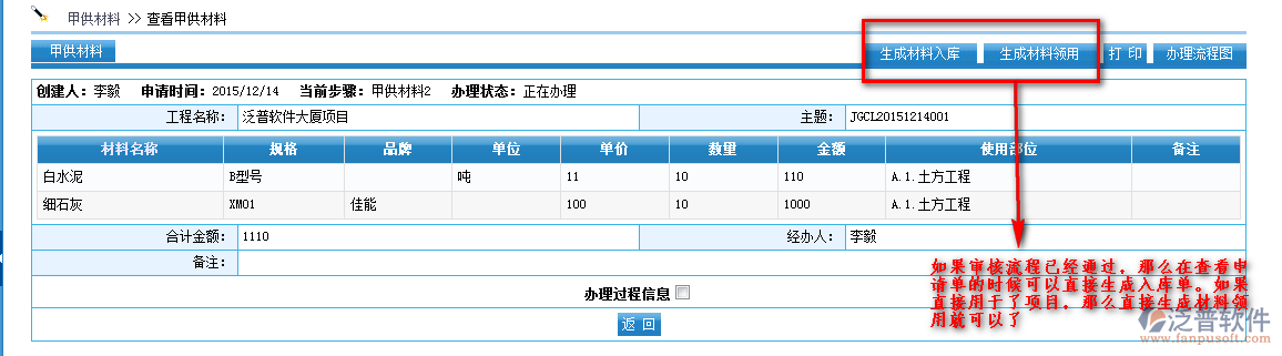 甲供材料審批通過拉到現(xiàn)場后辦理直接辦理入庫操作