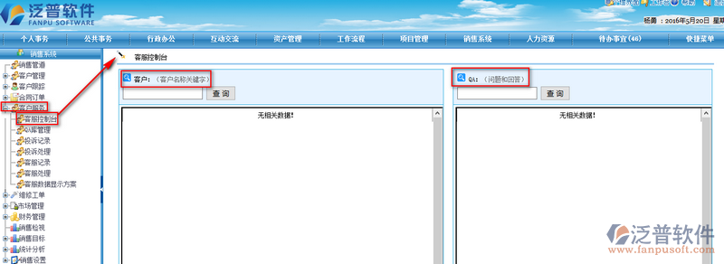 1、進(jìn)入到我們的oa系統(tǒng),打開【銷售系統(tǒng)】--【客戶服務(wù)】--【客服控制臺(tái)】即可了解我們客戶和QA設(shè)置情況,也可以及時(shí)了解客戶的反饋情況,也便于領(lǐng)導(dǎo)層視察工作。如下圖所示: