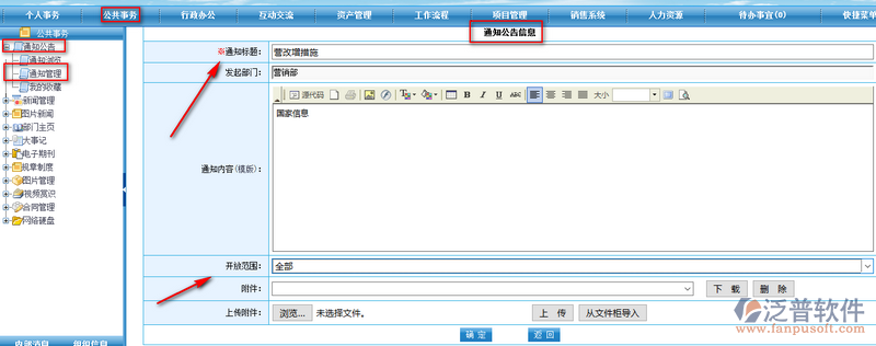 點(diǎn)擊【公共事務(wù)】--【通知公告】--【通知管理】可見(jiàn)到如下界面可添加公告: