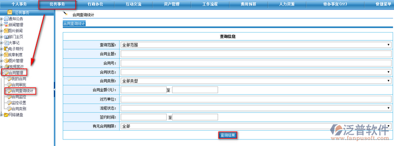 通過【公共事務】——【合同管理】——【合同查詢統(tǒng)計】,進入合同查詢統(tǒng)計頁面,頁面如下圖所示??梢园凑斩喾N條件組合進行查詢。填寫完信息后,單擊查詢結果即可。