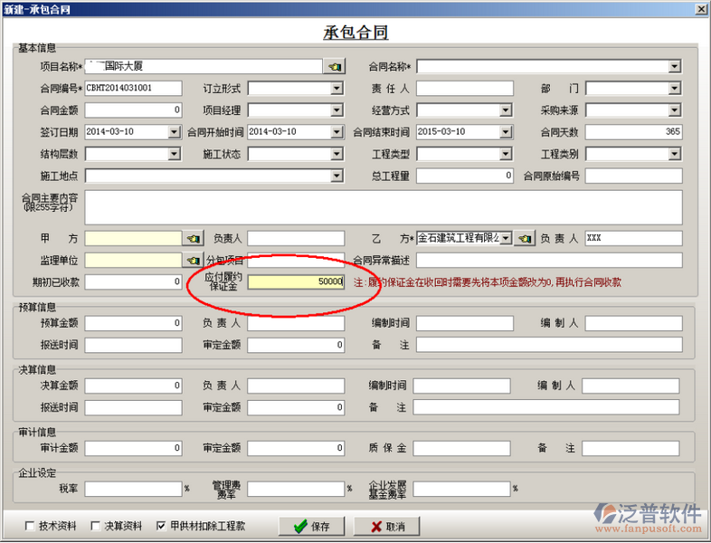 左邊選中新建的項目名稱泛普國際大廈,右邊點擊新建,彈出新建承包合同窗口,錄入合同基本信息,填寫合同履約保證金金額,然后保存。