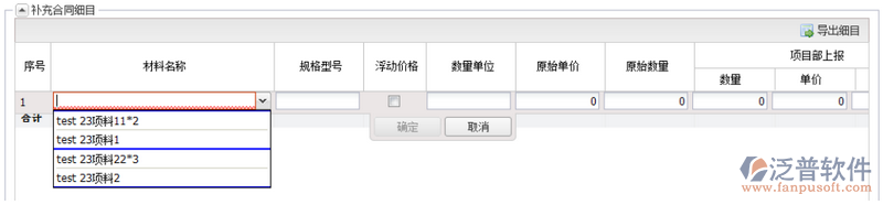 1. 材料名稱、規(guī)格型號(hào)、數(shù)量單位:右擊新增一條明細(xì),點(diǎn)擊“材料名稱”下拉框,下拉框列表里面列出物資總計(jì)劃里面已有的物資,如下圖所示: