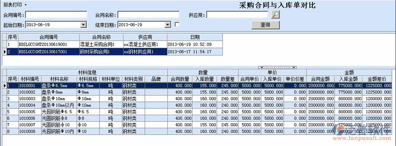 “材料采購(gòu)管理”下的“采購(gòu)合同與入庫(kù)單對(duì)比”,以采購(gòu)合同里面的材料為基礎(chǔ),與入庫(kù)單進(jìn)行對(duì)比分析數(shù)量和單價(jià)。