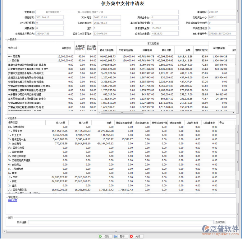 4. 本次申請付款金額:外部債務(wù)明細(xì)表中的擬付款金額+其他債務(wù)明細(xì)表中的項目申請付款金額;