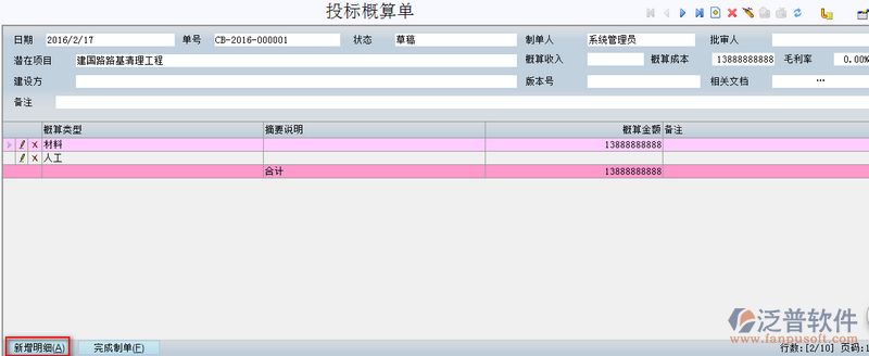 2、通過主表中的【新增明細(xì)】可以添加新的投標(biāo)概算信息。如圖: