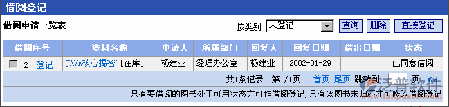 點(diǎn)擊“借閱登記”菜單,進(jìn)入“借閱登記管理”列表頁面。頁面將列出公司所有的資料借閱信息和經(jīng)回復(fù)的借閱申請(qǐng)信息。用戶也可按照登記類別進(jìn)行查詢。