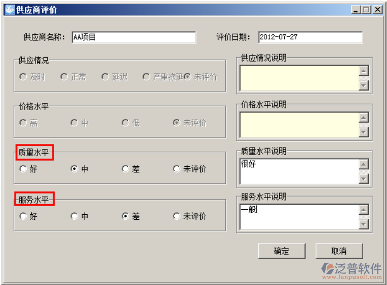 按鈕,彈出供應(yīng)商評價窗口,對供應(yīng)商的“服務(wù)水平”、“質(zhì)量水平”進(jìn)行評價。