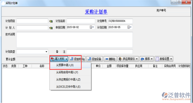 在新建采購計(jì)劃單時,添加材料內(nèi)容選擇從預(yù)算中調(diào)入,如下圖