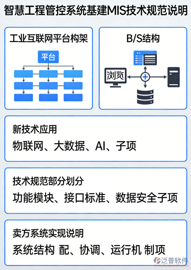 智慧工程管控系統(tǒng)基建MIS采用工業(yè)互聯(lián)網(wǎng)平臺(tái)構(gòu)架,軟件平臺(tái)采用B/S結(jié)構(gòu),易于使用、易于擴(kuò)展??紤]“新”技術(shù)在智慧工程信息管理的應(yīng)用。對(duì)直接用于智慧工程信息管理的技術(shù)規(guī)范要求,本文分若干部分進(jìn)行說明。需要指出的是:這些部分的劃分并不代表對(duì)賣方提供軟件系統(tǒng)的結(jié)構(gòu)要求,而僅僅是出于闡述功能要求的方便。賣方可以根據(jù)自己提供產(chǎn)品的特點(diǎn),以不同的軟件系統(tǒng)及其結(jié)構(gòu)來滿足本技術(shù)規(guī)范的要求,并對(duì)如何實(shí)現(xiàn)其協(xié)調(diào)運(yùn)行予以說明。