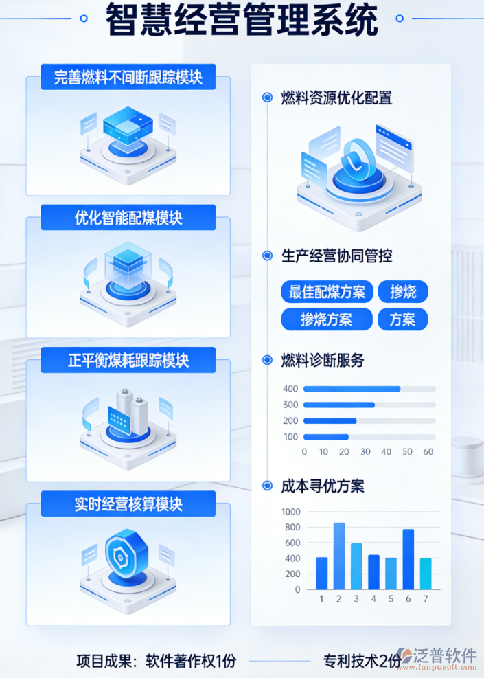 2)建成一套智慧經(jīng)營管理系統(tǒng),包括完善燃料不間斷跟蹤模塊、優(yōu)化 智能配煤模塊、正平衡煤耗跟蹤模塊、實(shí)時(shí)經(jīng)營核算模塊。通過燃料資源 優(yōu)化配置和生產(chǎn)經(jīng)營的協(xié)同管控,提供最佳配煤方案、摻燒方案、燃料診 斷服務(wù)、成本尋優(yōu)方案等,從而實(shí)現(xiàn)降低燃料成本,優(yōu)化資源配置,提高 全廠的經(jīng)濟(jì)效益。項(xiàng)目實(shí)施并驗(yàn)收后申請軟件著作權(quán)1份、專利技術(shù)2 份。