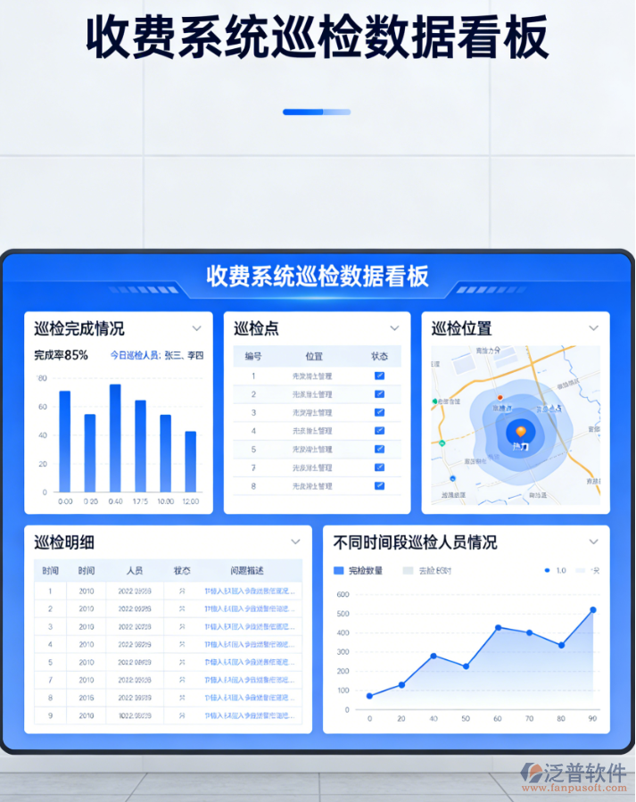 該看板主要展示了收費(fèi)系統(tǒng)巡檢的完成情況、巡檢位置、巡檢點(diǎn)、巡檢明細(xì)等。通過該統(tǒng)計(jì)數(shù)據(jù),詳細(xì)展示了不同時(shí)間段巡檢人員的巡檢情況等信息,方便管理人員及時(shí)查看和監(jiān)督,采取對應(yīng)措施。