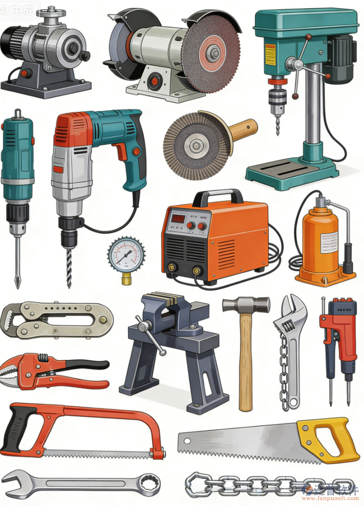 套絲機、砂輪鋸、臺鉆、電錘、手砂輪、手電鉆、電焊機、電動試壓泵等機械,套絲板、管鉗、臺鉗、壓力鉗、鏈鉗、手錘、鋼鋸、板手、射釘槍、倒鏈、電氣焊工具等。