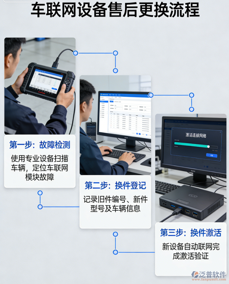 車主在使用過程中發(fā)生車聯(lián)網(wǎng)故障,需要到4S店更換車聯(lián)網(wǎng)設(shè)備,系統(tǒng)提供故障檢測、換件登記、換件激活等能力。