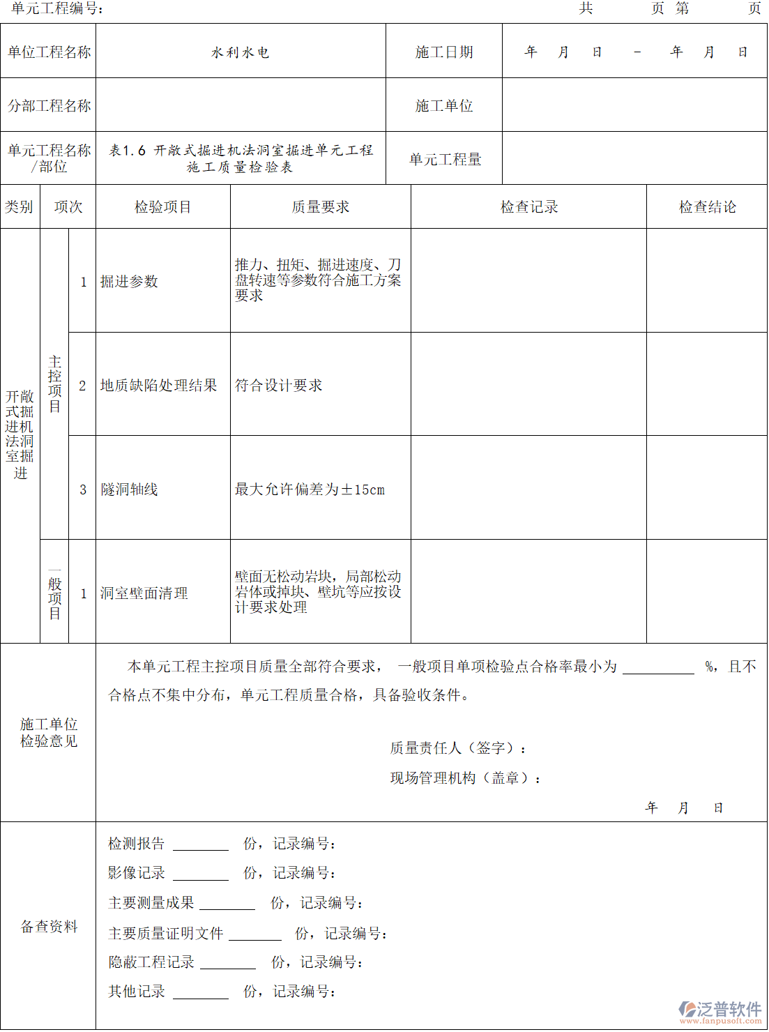 水利水電開敞式掘進機法洞室掘進單元工程施工質(zhì)量檢驗表