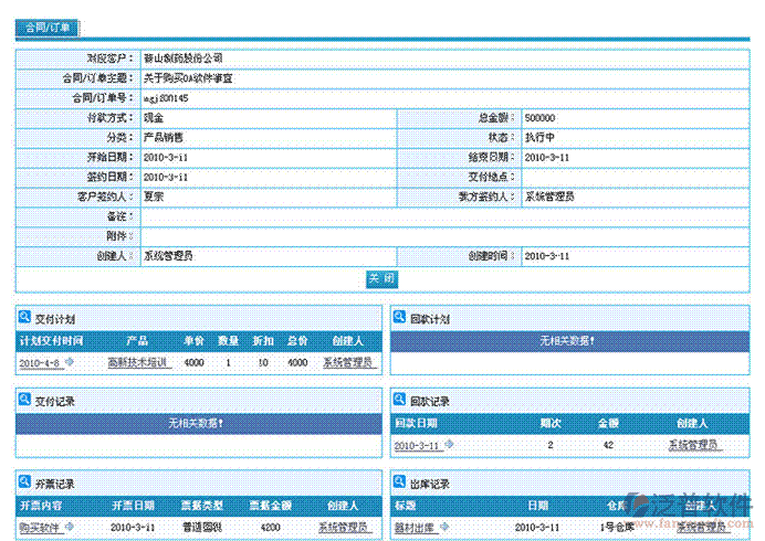 合同信息管理:記錄合同的主要信息,包括合同編號(hào)、合同類(lèi)別、簽單日期、合同的甲方乙方、雙方的簽約人、合同金額,預(yù)計(jì)合同毛利等;記錄合同的條款、相關(guān)產(chǎn)品、特殊需求等信息;