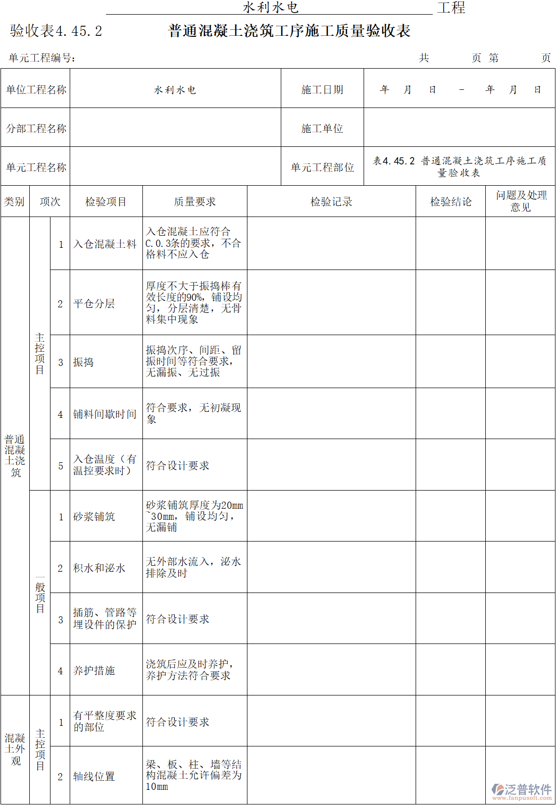 水利水電普通混凝土澆筑工序施工質(zhì)量驗(yàn)收表