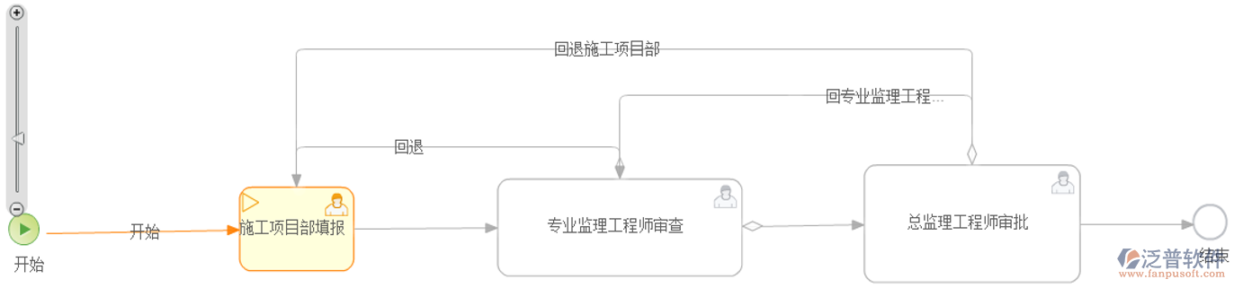 在流程編輯頁面,標(biāo)題、工程名稱、編號(hào)等信息自動(dòng)獲取,審批通過則待總監(jiān)審核,否則,退回施工項(xiàng)目部重新編制。