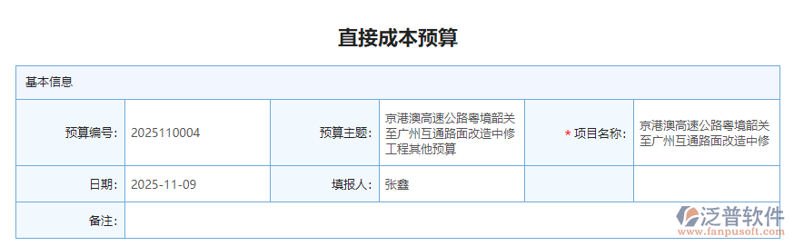 4、 泛普軟件安防工程管理系統(tǒng)中的預算管理是將直接成本預算和間接成本預算分開在管理,方便后期財務人員做成本統(tǒng)計。