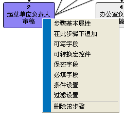 設(shè)置好步驟以后,我們還需要進(jìn)行步驟中的“可寫(xiě)字段”設(shè)置、“追加下一步驟”等操作。首先我們用鼠標(biāo)左鍵點(diǎn)擊一下要設(shè)置的步驟,點(diǎn)擊以后步驟顏色變?yōu)樽仙?,然后再鼠?biāo)上面點(diǎn)擊右鍵出現(xiàn)各項(xiàng)右鍵菜單。如圖: