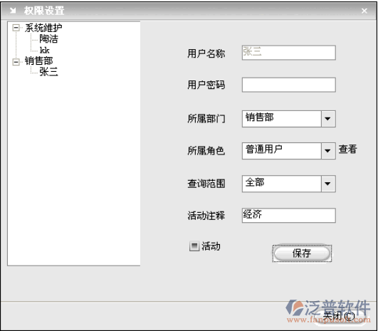 用戶設(shè)置主要是對每個用戶進行部門分配、角色的安排、查詢范圍的定義、密碼的設(shè)定以及對活動和非活動的狀態(tài)的設(shè)置,并且以樹型結(jié)構(gòu)表示部門下的部門成員??梢詫τ脩暨M行修改和刪除操作。