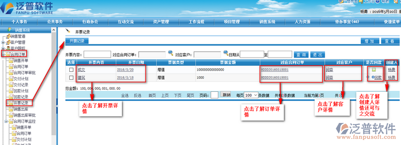 3、在我們開票記錄界面,點(diǎn)擊開票日期或者開票內(nèi)容,可了解開票的詳細(xì)內(nèi)容;點(diǎn)擊對(duì)應(yīng)的合同訂單,可了解詳細(xì)的合同信息;點(diǎn)擊對(duì)應(yīng)客戶可了解客戶的詳細(xì)信息等,增強(qiáng)了我們的數(shù)據(jù)的連貫性,方便了我們的操作。如下圖所示:
