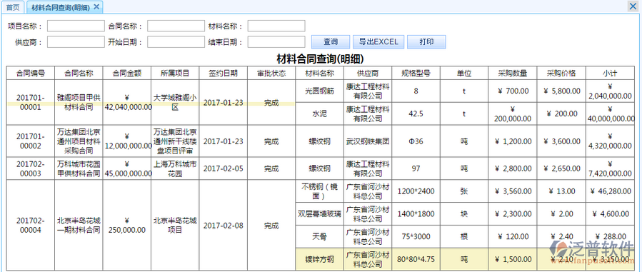3、可以通過(guò)房地產(chǎn)企業(yè)管理系統(tǒng)的合同分析查詢明細(xì)查詢,也可以按照合同編號(hào)、合同名稱、項(xiàng)目名稱、材料名稱等查詢到具體的材料采購(gòu)合同中的材料名稱、采購(gòu)數(shù)量、采購(gòu)價(jià)格、采購(gòu)小計(jì)等信息,也可以按照供應(yīng)商的分類來(lái)查詢采購(gòu)匯總情況。也可以導(dǎo)出材料采購(gòu)明細(xì)數(shù)據(jù)與對(duì)應(yīng)的供應(yīng)商進(jìn)行對(duì)賬相關(guān)事宜