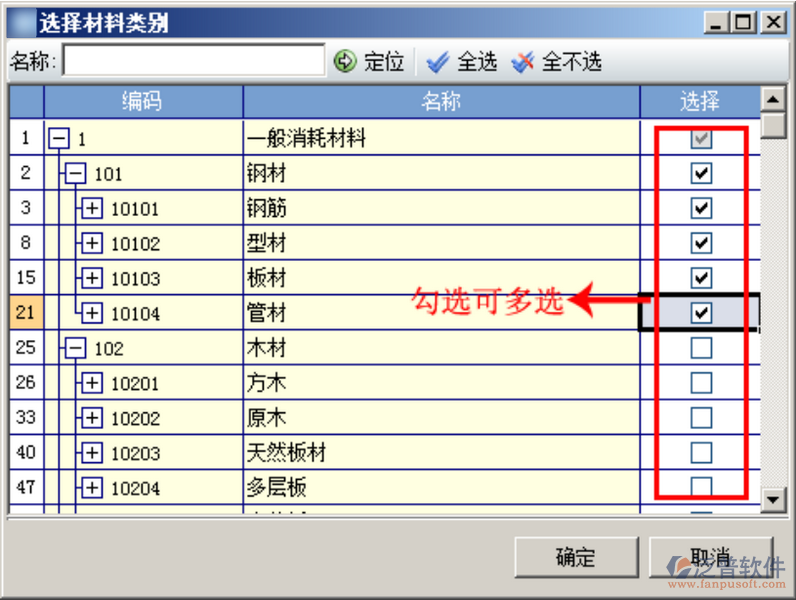 從中勾選要查詢的材料類別,默認為材料字典中的所有材料類別。