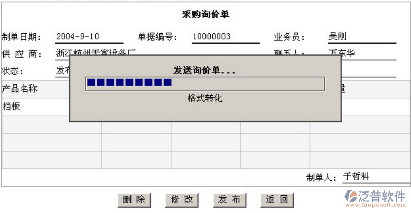 填寫好的采購詢價單經(jīng)過發(fā)布后,會發(fā)送到系統(tǒng)后臺并經(jīng)過處理,由系統(tǒng)自動回發(fā)一張報價單。