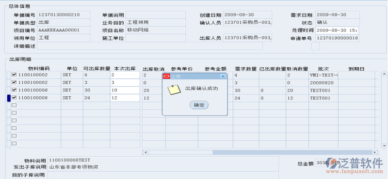 點(diǎn)擊“確定”完成出庫(kù)確認(rèn)操作,單據(jù)狀態(tài)顯示為“確認(rèn)”。