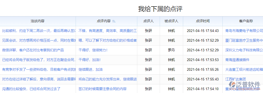 4、系統(tǒng)中將每次領(lǐng)導(dǎo)給自己的點(diǎn)評(píng)和自己給其他銷售人員的跟進(jìn)點(diǎn)評(píng)進(jìn)行統(tǒng)計(jì),這樣對(duì)企業(yè)來(lái)說(shuō)也有相應(yīng)的知識(shí)庫(kù),后期對(duì)銷售人員的沉淀也有幫助。領(lǐng)導(dǎo)層也能知曉銷售部門(mén)的每次跟進(jìn)點(diǎn)評(píng)情況,將整個(gè)過(guò)程進(jìn)行反應(yīng)