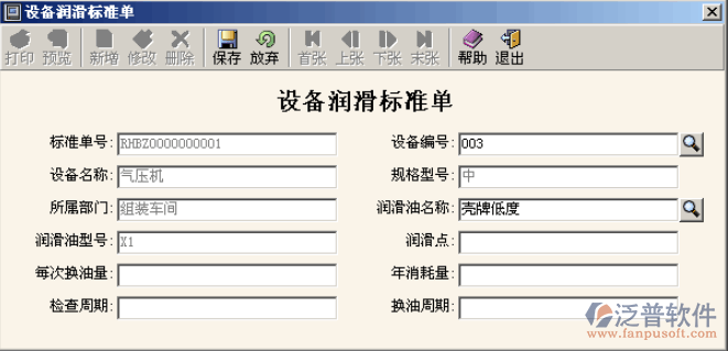 1、 設(shè)備潤滑標(biāo)準(zhǔn)。在此錄入設(shè)備潤滑標(biāo)準(zhǔn)單。錄入該單后,針對該標(biāo)準(zhǔn)單另外有記錄單,可選中該列表,為該列表增加記錄。