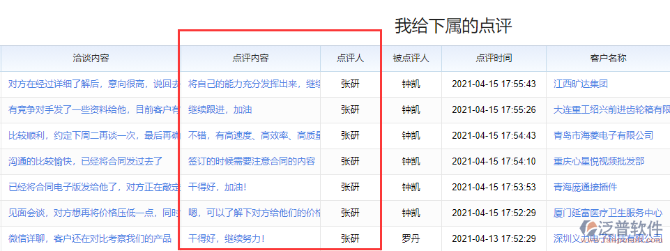 當(dāng)前位置:工程項(xiàng)目OA系統(tǒng) > ERP系統(tǒng) > 功能詳情 > 銷(xiāo)售管理 > 客戶管理 > 跟進(jìn)點(diǎn)評(píng) > 我給下屬的點(diǎn)評(píng)