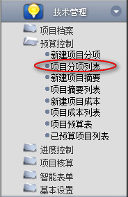 點(diǎn)擊辦公模式→技術(shù)管理→預(yù)算控制→項(xiàng)目分項(xiàng)列表,進(jìn)入“項(xiàng)目分項(xiàng)列表”窗口: