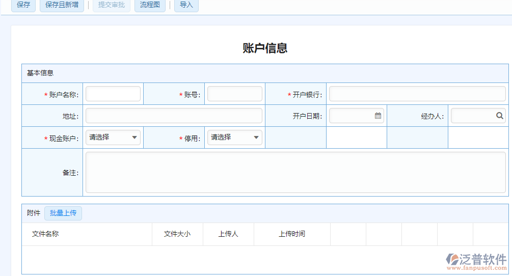 1、【錄入數(shù)據(jù)】→【保存】∶錄入賬戶名稱、賬號、開戶銀行、地址、開戶日期、經(jīng)辦人、現(xiàn)金賬戶、是否停用、備注以上信息,并上傳相關(guān)附件。