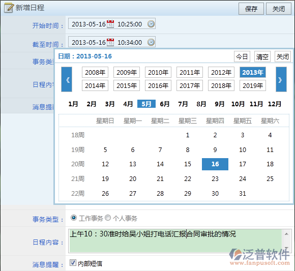 每個(gè)員工可以自由設(shè)置提醒信息,用戶可以制定周期性事務(wù),并采用內(nèi)部短信形式提醒,對(duì)于長(zhǎng)期從事的相同工作,可以避免每日的重復(fù)設(shè)置。周期性可以按照每日提醒、每星期提醒、每月提醒、每年提醒,以及設(shè)置定時(shí)提醒某一件事情。這樣可以對(duì)一些定時(shí)周期提醒的事務(wù)處理,避免漏掉工作。