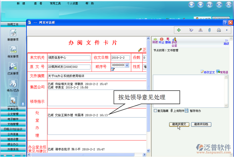 注:處領(lǐng)導(dǎo)填寫承辦意見時(shí),要求填寫交處室內(nèi)哪些人員辦理,接下來公文管理員將根據(jù)填寫的承辦意見,多級(jí)會(huì)簽給相關(guān)的辦理人員。
