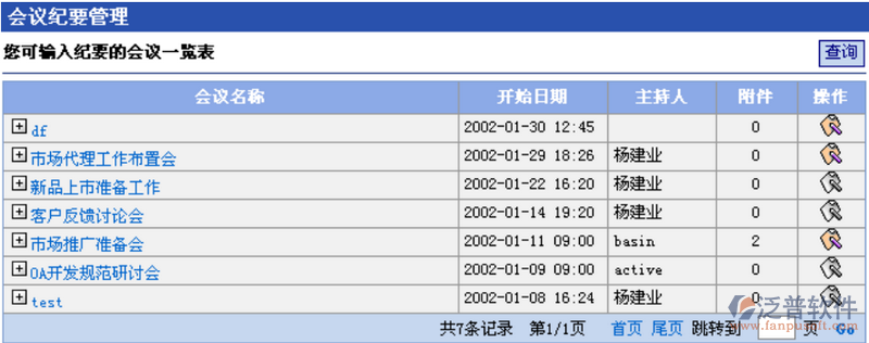 點(diǎn)擊[查詢]可按指定的查詢條件(會議主題、會議名稱、會議說明、會議日期等)查詢顯示有關(guān)會議。