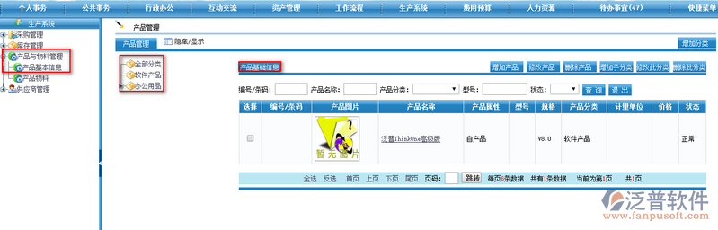 通過(guò)【產(chǎn)品物料】——【產(chǎn)品物料管理】——【產(chǎn)品基本信息】進(jìn)入產(chǎn)品信息管理頁(yè)面,左邊為已新建的類,右邊顯示了已增的產(chǎn)品信息和有一系列操作按鈕