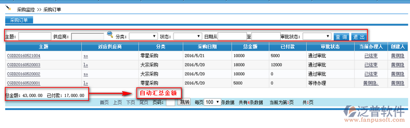 下方會自動顯示采購訂單的總金額??梢愿鶕?jù)條件進行篩選查詢。點擊供應(yīng)商名稱,可以查看供應(yīng)商的詳細信息;上方可以根據(jù)條件進行篩選查詢。點擊創(chuàng)建人,可以查看發(fā)起次夠計劃的人