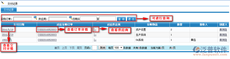 點擊時間,可查看具體的付款記錄;點擊采購訂單名稱,可查看訂單的詳細情況;點擊供應(yīng)商名稱,可以查看供應(yīng)商的詳細信息;上方可以根據(jù)條件進行篩選查詢;點擊創(chuàng)建人,可以查看此人詳細信息。