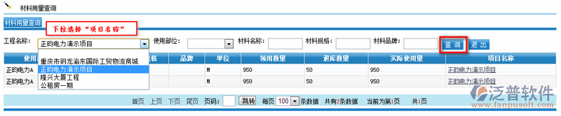 2、下拉選擇“工程名稱”點(diǎn)擊查詢,查詢這個(gè)項(xiàng)目所有的材料使用情況,可以查看到“材料領(lǐng)用量”是多少“材料退庫(kù)量”是多少“材料實(shí)際使用量”是多少