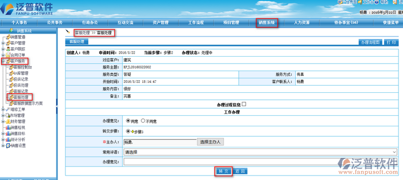 2、打開【服務主題】可了解到處理的詳細情況,點擊【轉(zhuǎn)交】可跳轉(zhuǎn)到下個審批環(huán)節(jié)。如下圖所示: