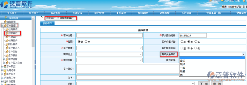 3、打開【銷售系統(tǒng)】--【客戶管理】--【我的客戶】,在新增我的客戶界面客戶關(guān)系等級欄目可選擇(系統(tǒng)中其他需要選擇的時候,都可以同步,以上只表示其中一個模塊的選擇添加),也可看到上文中設(shè)置的分類,如下圖所示: