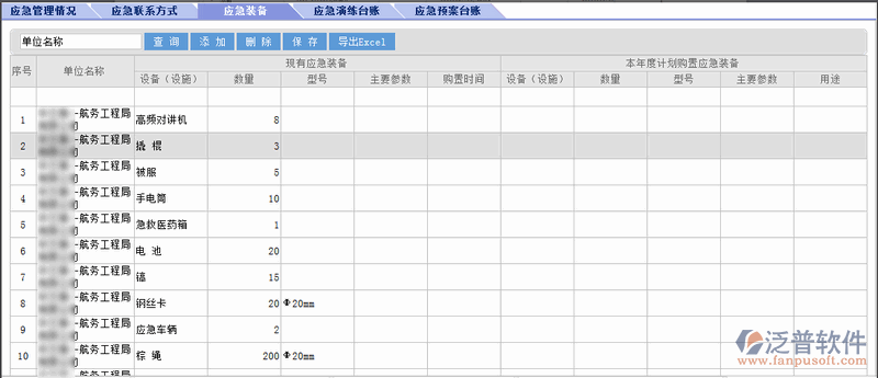 在【應(yīng)急管理】頁面,點(diǎn)擊【添加】按鈕,頁面頂部出現(xiàn)一行空白記錄,錄入完相關(guān)信息后,點(diǎn)擊【保存】按鈕,完成保存。