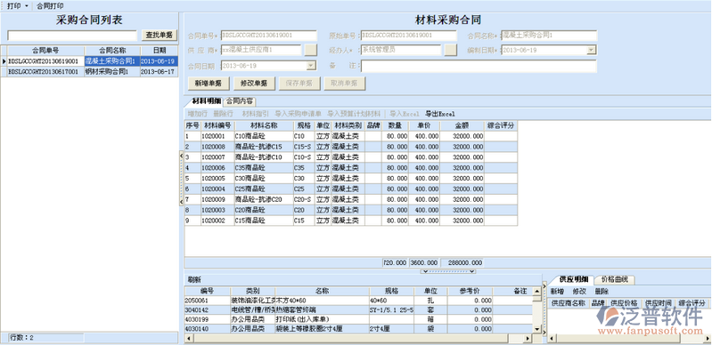 “材料采購管理”下的“材料采購合同”(用于填寫與供應商簽訂的采購合同的記錄合同的材料數(shù)量和單價及合同內(nèi)容的簡介)。操作方式與預算計劃和采購計劃單一樣,這里不做過多介紹。