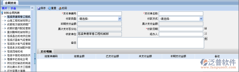 系統(tǒng)會(huì)自動(dòng)將和該合同關(guān)聯(lián)的結(jié)算單引用過來,填寫具體的支付金額即可
